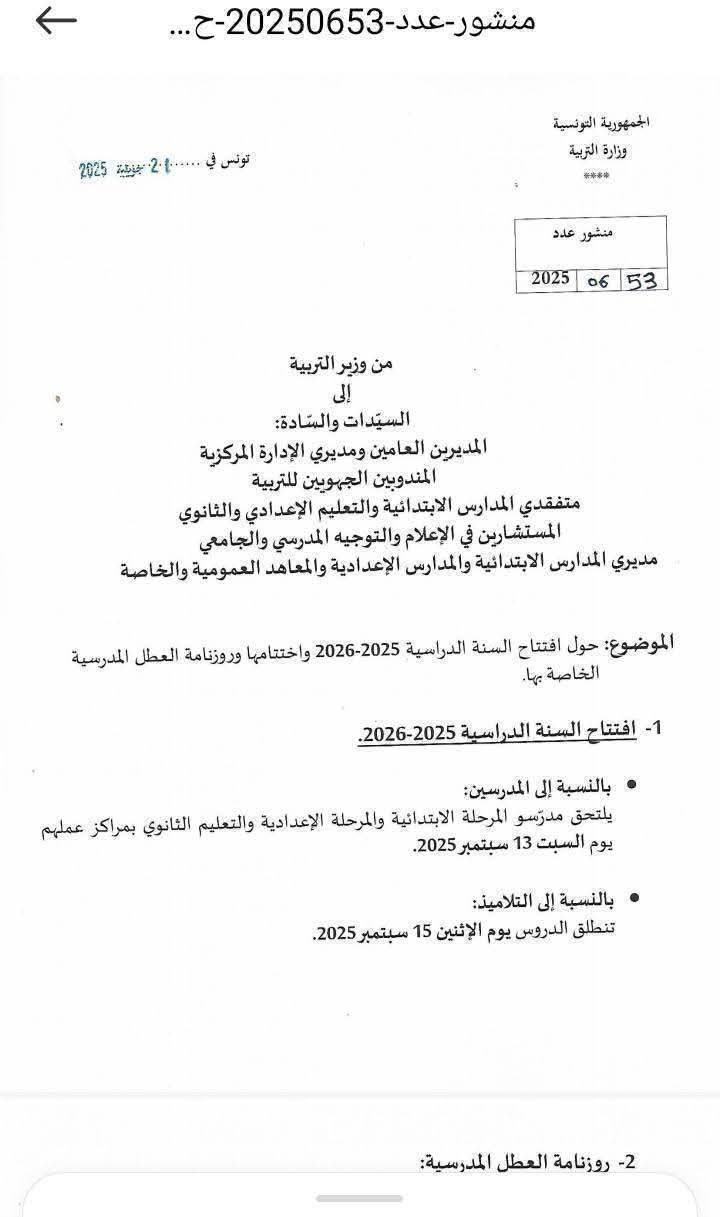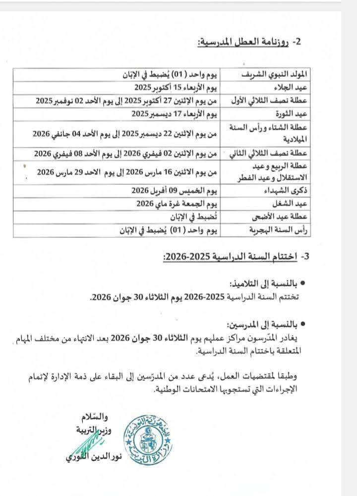 منشور وزارة التربية حول إفتتاح وإختتام السنة الدراسية 2025_2026 ورزنامة العطل المدرسية.بواسطة Admin / 21 يوليو، 2025 منشور وزارة التربية حول إفتتاح وإختتام السنة الدراسية 2025_2026 ورزنامة العطل المدرسية.