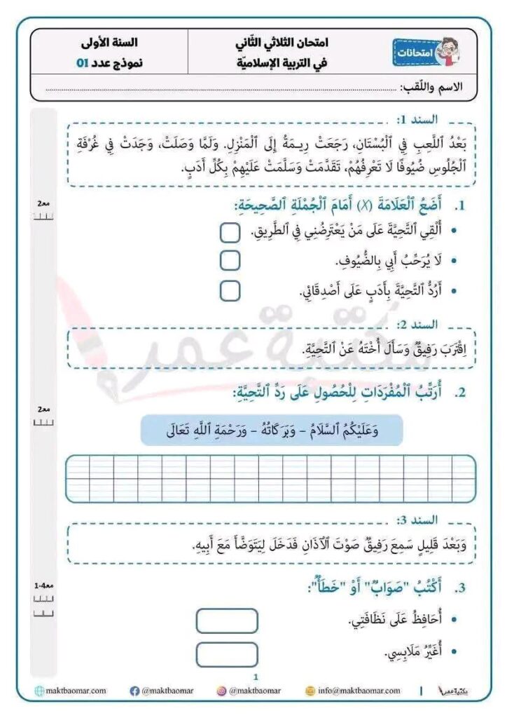 امتحانات التربية الاسلامية السنة الثلاثي الثاني